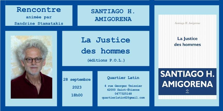 Jeudi 28 septembre à 18h : Santiago H. Amigorena, La justice des hommes, P.O.L. Rencontre animée par Sandrine Stamatakis (enseignante au Lycée Fauriel) Peut-on se quitter en s’aimant ? Peut-on s’aimer en se quittant ? Alice et Aurélien forment un jeune couple qui, comme tant de couples, ne trouve pas de réponses aux questions qu’il se pose.Lire la suite « Rencontre avec Santiago H. Amigorena / La Justice des hommes »