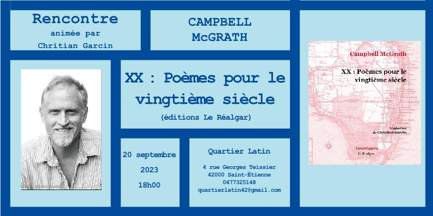 Mercredi 20 septembre à 18h : Campbell Mc Grath, XX : Poèmes pour le vingtième siècle, Le Réalgar. Rencontre animée par son traducteur, Christian Garcin. XX : Poèmes pour le vingtième siècle est un recueil de poèmes majoritairement narratifs, qui proposent une approche à la fois poétique, historique et documentée du siècle par le petit bout de la lorgnette. LeLire la suite « Rencontre avec Campbell McGrath / XX : Poèmes pour le vingtième siècle »