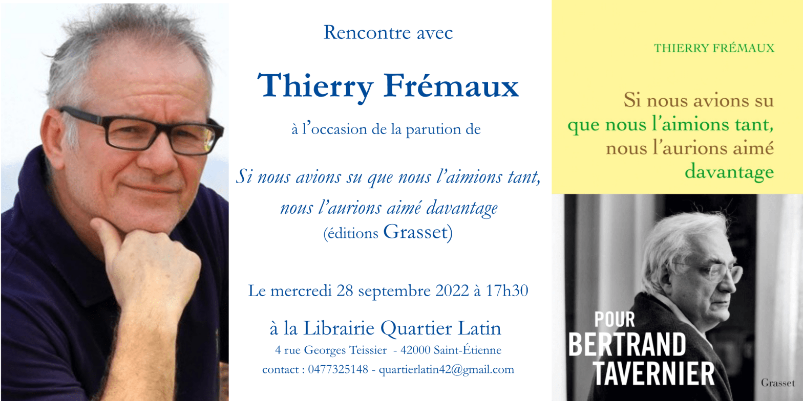 À l’occasion de la venue de Thierry Frémaux le mercredi 28 septembre à la Cinémathèque de Saint-Etienne dans la cadre de la carte blanche au Festival Lumière, la librairie Quartier Latin vous invite à une rencontre suivie d’une signature à la librairie à partir de 17h30. – 14h30 à 16h : Diffusion du documentaire, « LumièreLire la suite « Rencontre avec Thierry Frémaux«